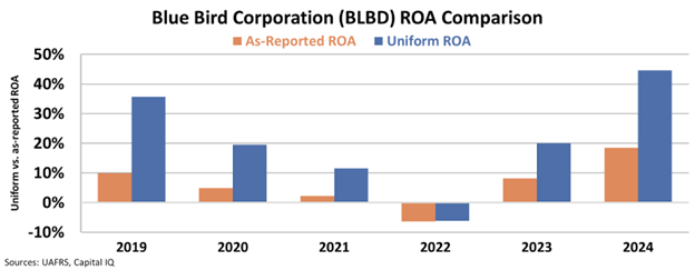 However, Uniform Accounting shows the company is far more profitable than as-reported financials suggest. After generating a Uniform ROA of 20% in 2023, Blue Bird vastly improved its returns to 45% last year.