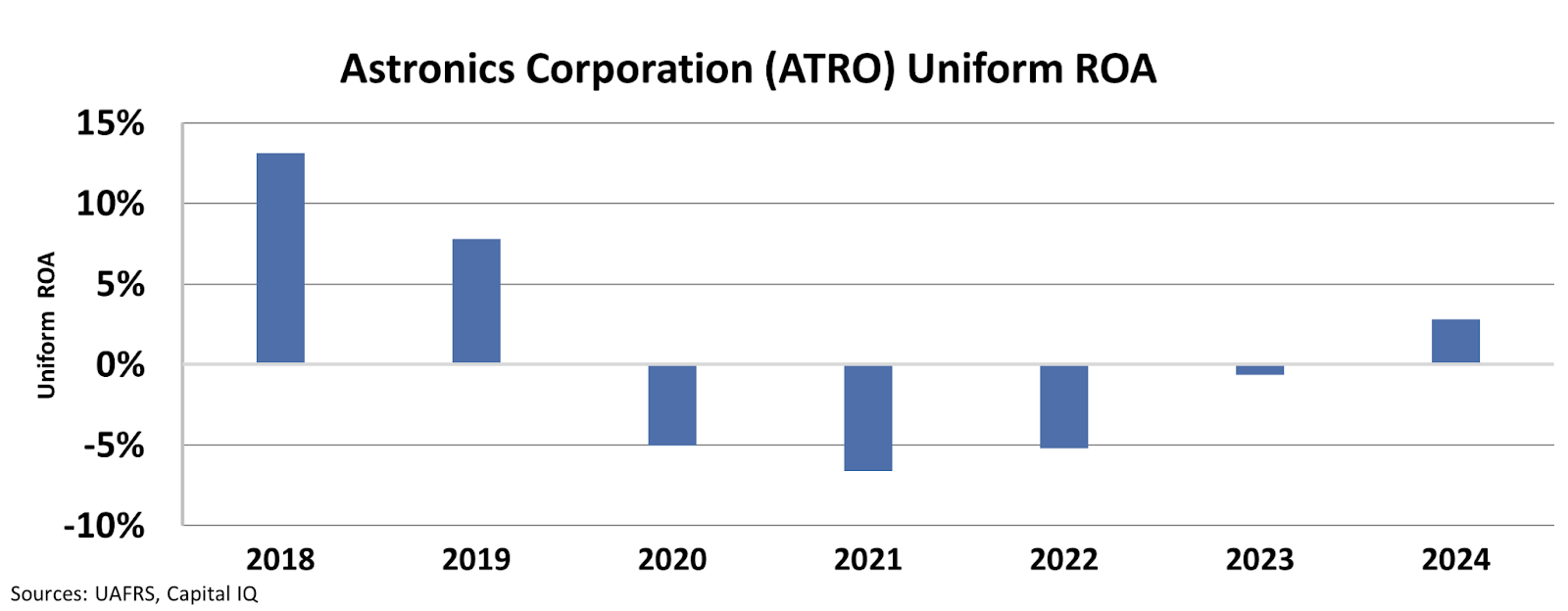 Astronics’ Uniform return on assets (“ROA”) nosedived from 13% in 2018 to -5% in 2020. From that year until 2023, returns trended negatively. This changed when returns inflected positive in 2024—the same year Boeing started to recover.