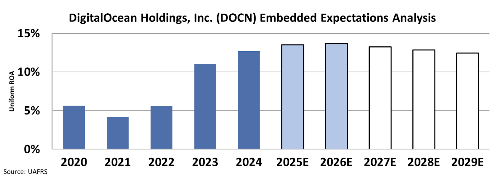 Since 2021, DigitalOcean’s Uniform return on assets (“ROA”) has risen from 4% to 12% as its business has grown. Wall Street analysts expect DigitalOcean’s returns to continue climbing in the coming years, reaching 13% by 2026. However, the market thinks ROA will decline slightly by 2029.