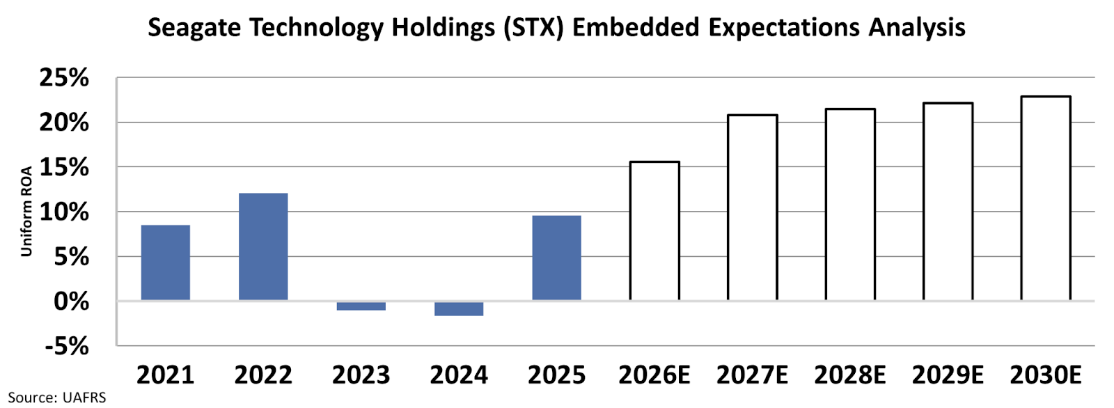 At current prices, investors are expecting Seagate’s Uniform return on assets (“ROA”) to rise steeply from 10% in 2025 to 23% by 2030.