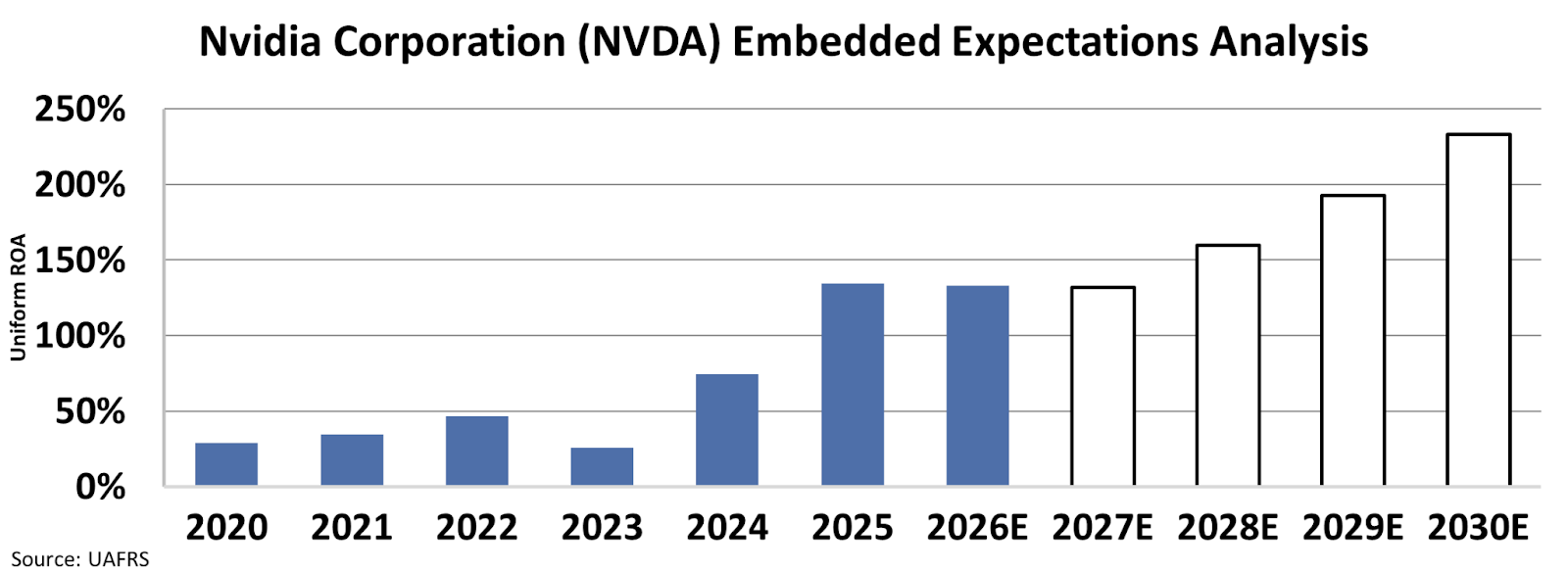 At current valuations, investors expect Nvidia’s Uniform ROA to continue to grow at breakneck speeds, reaching 232% by 2030.