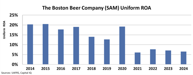 From 2014 to 2020, Boston Beer’s Uniform return on assets (“ROA”) averaged 18%. However, since then, Uniform ROA has fallen to around 7% levels, well below its historic average.