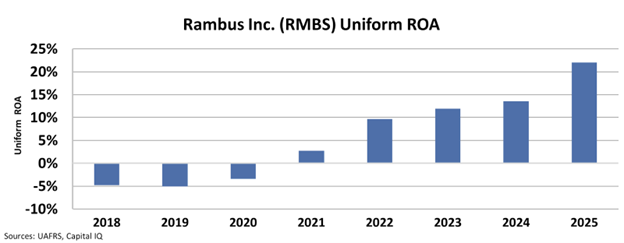 From there, Rambus’ returns grew quickly as the AI boom rolled around, seeing its Uniform ROA more than double from 10% in 2022 to 22% in 2025.