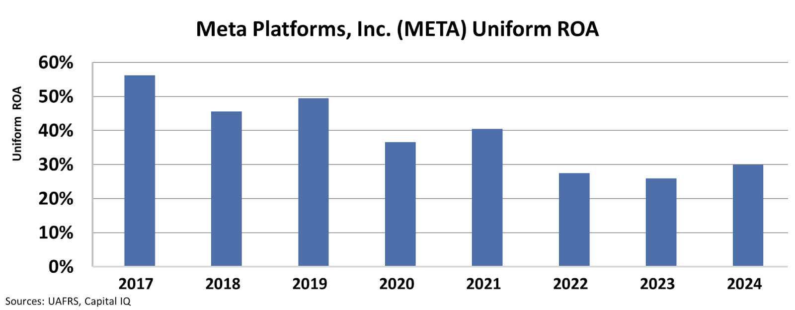 From 2017 until 2021, Meta consistently generated Uniform return on assets (“ROA”) between 37% and 56%. However, Uniform ROA has failed to surpass 30% levels since the company began investing heavily into the metaverse.