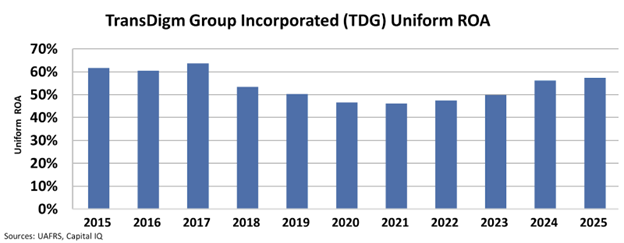 TransDigm has also delivered strong returns over the past decade. Since 2015, its Uniform return on assets (“ROA”) has never dipped below 40%, well above corporate averages.