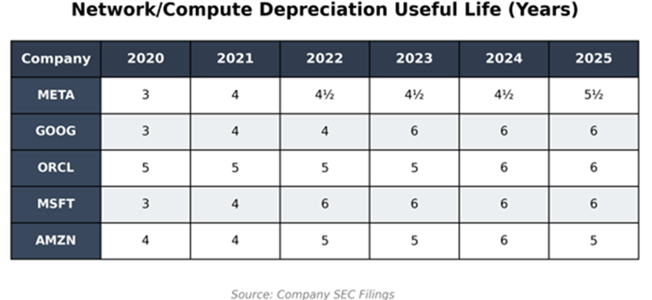Burry published a chart featuring all five major hyperscalers: Meta (META), Alphabet (GOOGL), Oracle (ORCL), Microsoft (MSFT), and Amazon (AMZN). It shows how each company’s depreciation useful life for server and networking assets has changed since 2020.