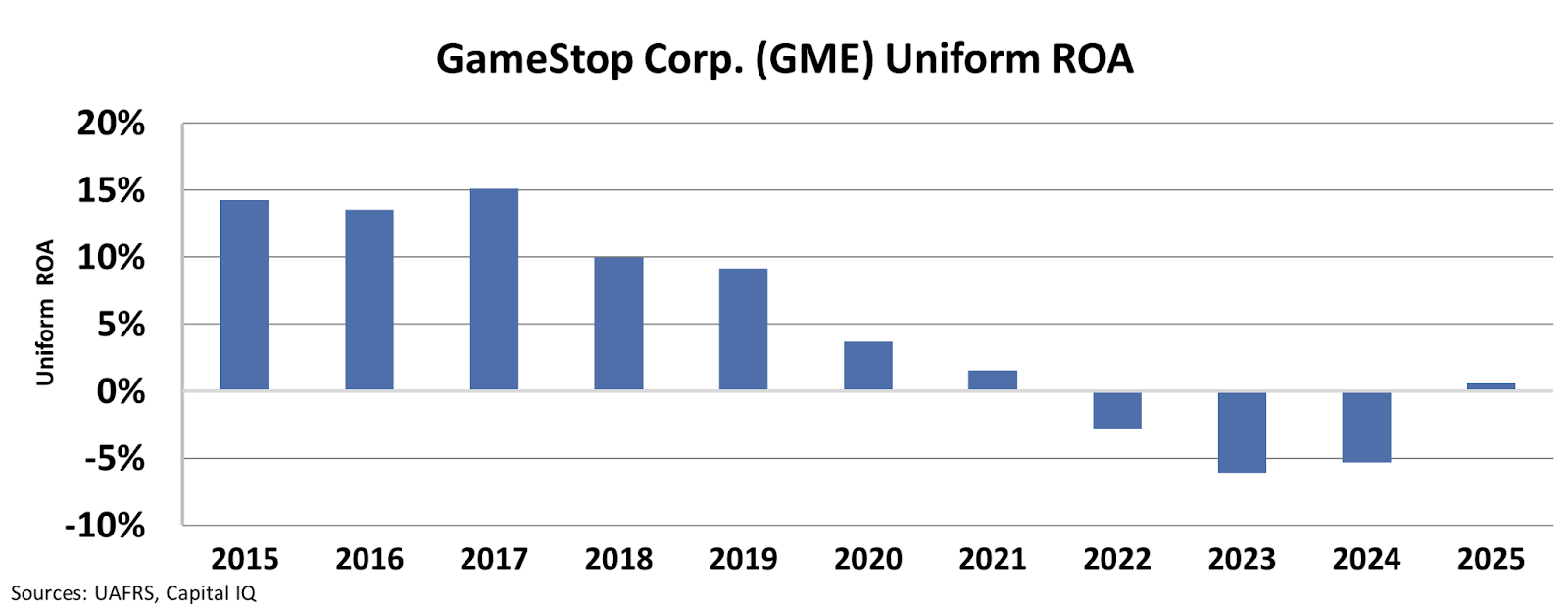Since 2017, GameStop’s Uniform return on assets (“ROA”) has declined steadily from 15% to just 1.6% by 2021. And from 2022 to 2024, the company delivered negative returns.