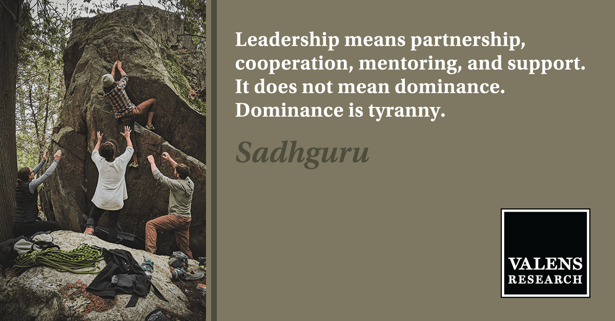 “Leadership means partnership, cooperation, mentoring, and support. It does not mean dominance. Dominance is tyranny.” – Sadhguru