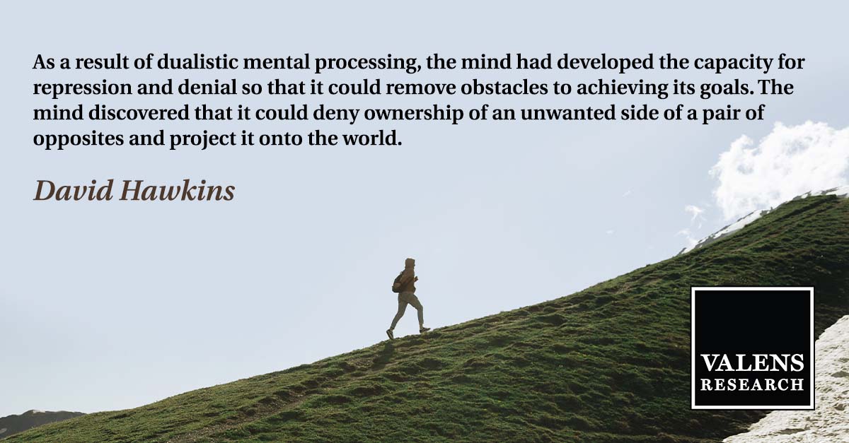 “As a result of dualistic mental processing, the mind had developed the capacity for repression and denial so that it could remove obstacles to achieving its goals. The mind discovered that it could deny ownership of an unwanted side of a pair of opposites and project it onto the world.” – David Hawkins